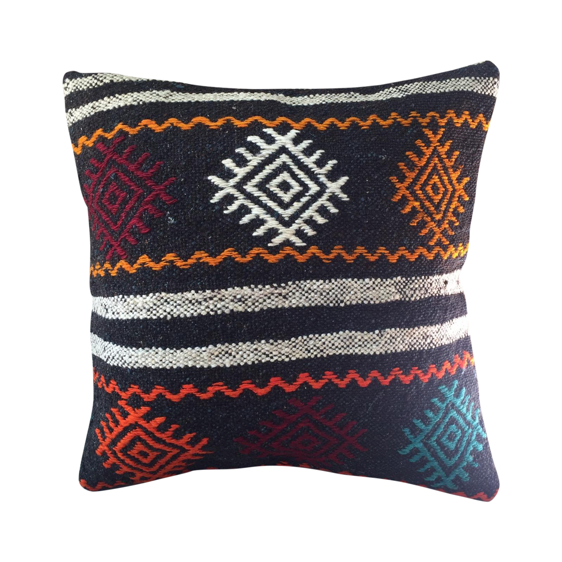 Vintage Turkish handmade patchwork kilim rug pillow cover, crafted from fabric in good vintage condition. This unique piece features a vibrant array of colors including black, orange, blue, white, red, and oranges, adding a lively touch to any space. The back of the pillow cover is made with new canvas fabric and includes a hidden zipper for easy insertion and removal of the pillow insert (not included). A 16" x 16" insert is recommended for a perfect fit.