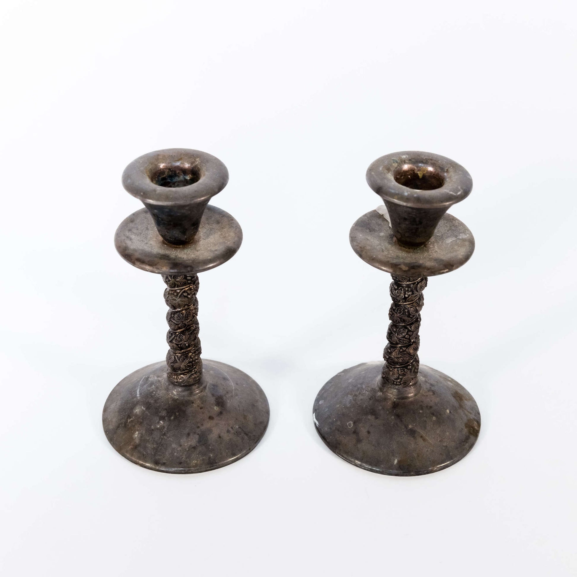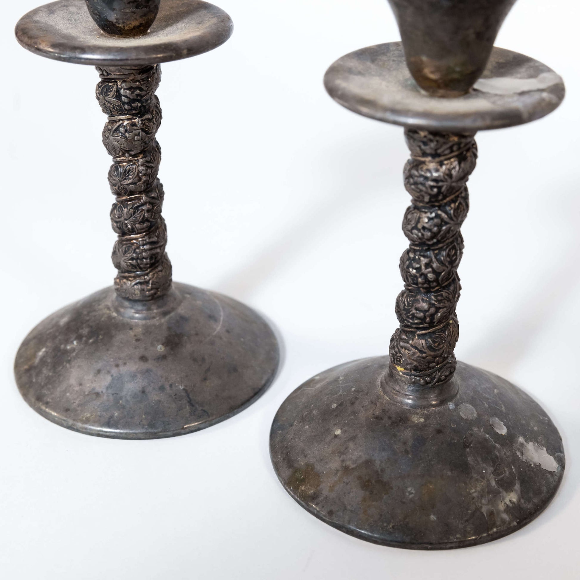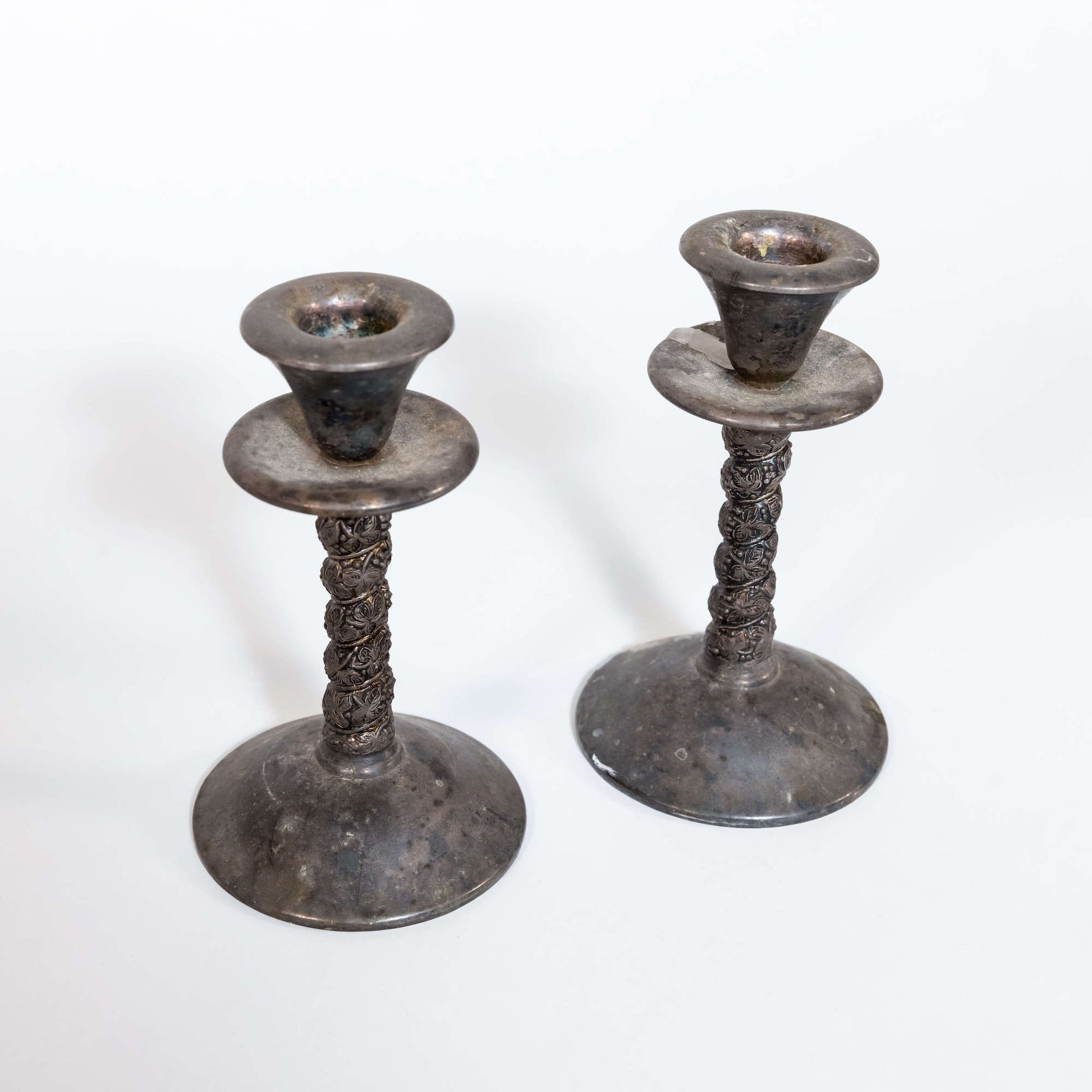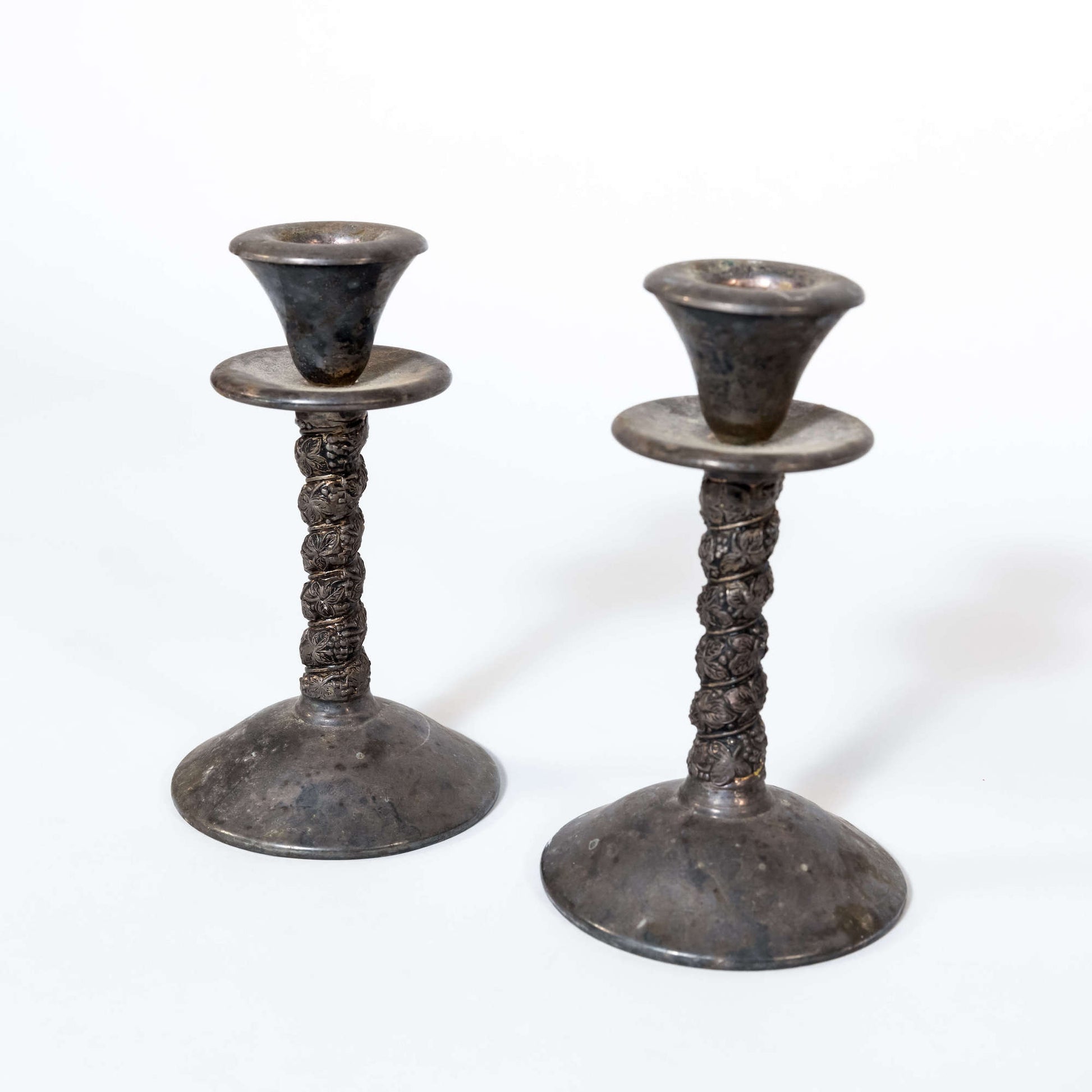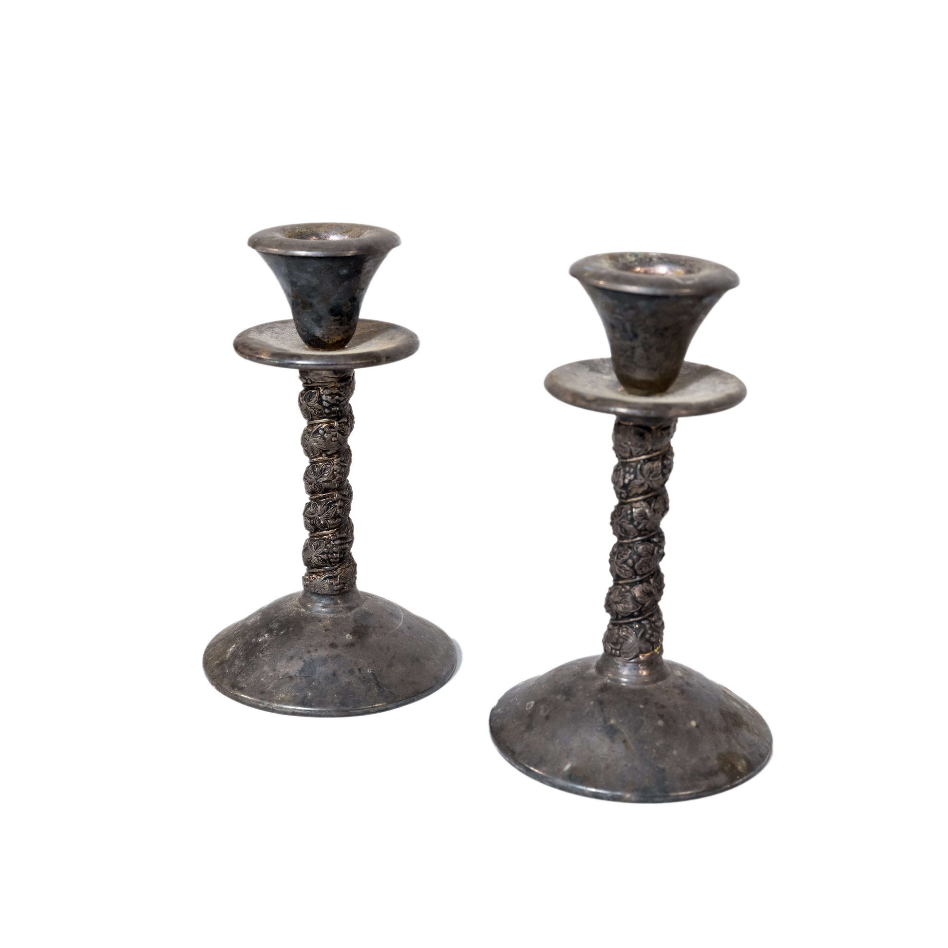 Two matching spiral candlesticks in a steel color, boasting a fair vintage condition with charming signs of wear typical of their age. Crafted by Original Plator in Spain, these silver-plated candle holders exude classic elegance. The grapevine motif adds a timeless touch to their design. Despite showing signs of use and slight tarnishing due to their vintage nature, these candlesticks retain their allure. Each piece is marked "Made in Spain" on the bottom, adding to their authenticity and historical value.