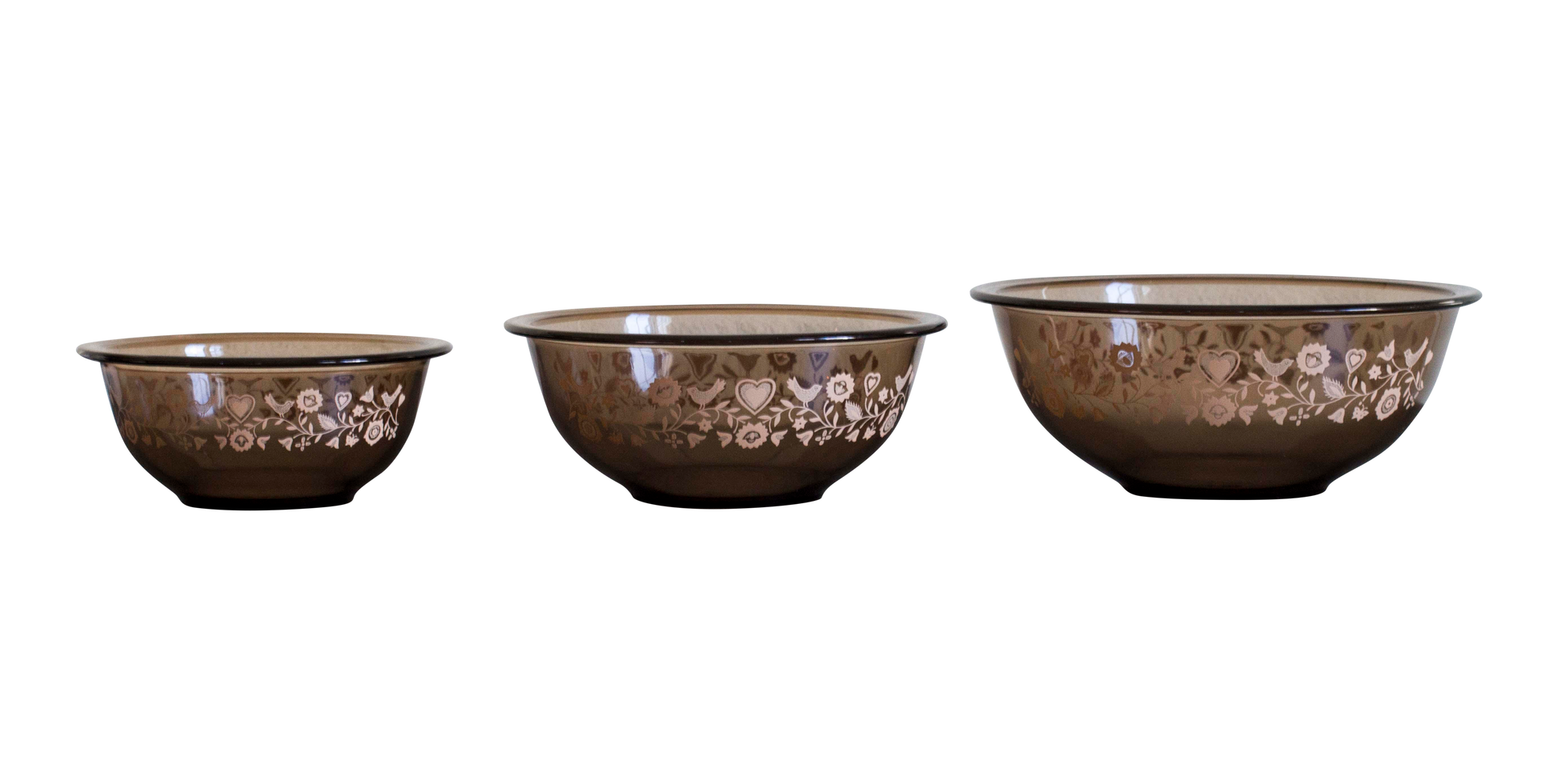 A true vintage find! Set of 3 Pyrex amber mixing bowls with a harvest motif. Motif consists of birds, hearts, flowers and vines. These bowls are in great vintage condition. Free of any chips, in excellent condition -- only minor curve to the smaller bowl (see photo for reference).