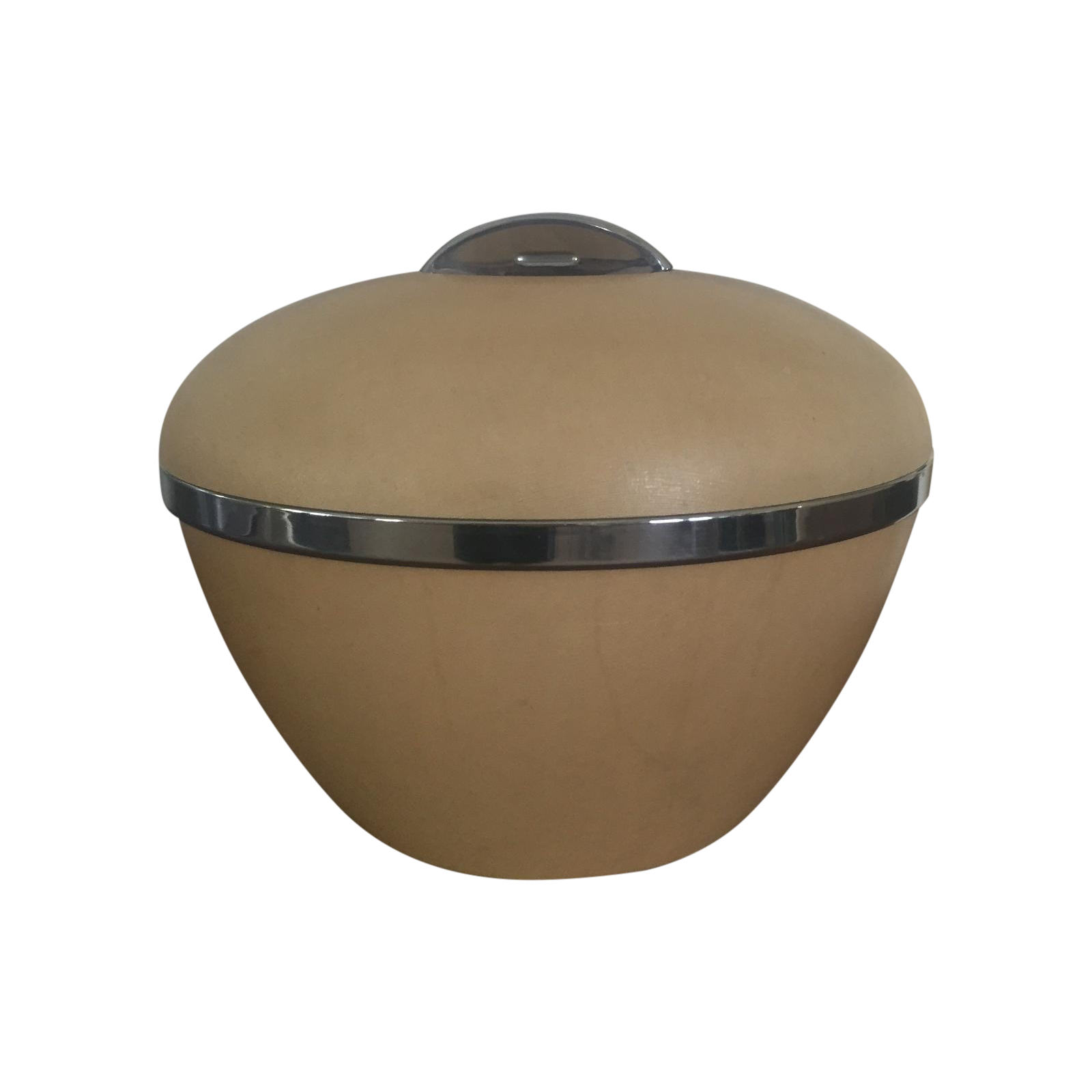 This is an awesome vintage meets retro, Sav-Ice ice bucket by Remington Rand Inc. With its tan exterior and silver accents this is must have for your bar collection. It is in good vintage condition with normal wear and tear. The top lid bears the brands label, Remington.