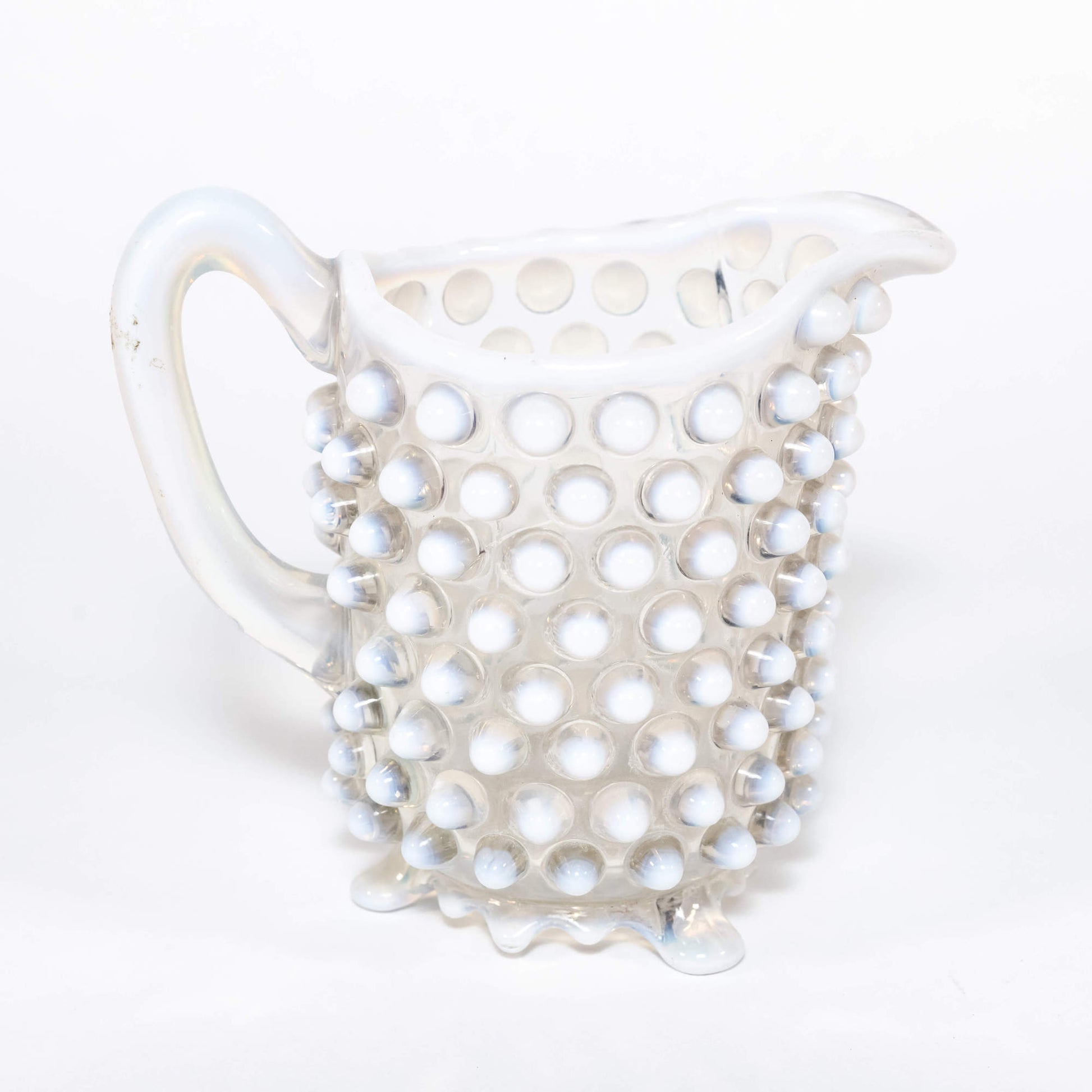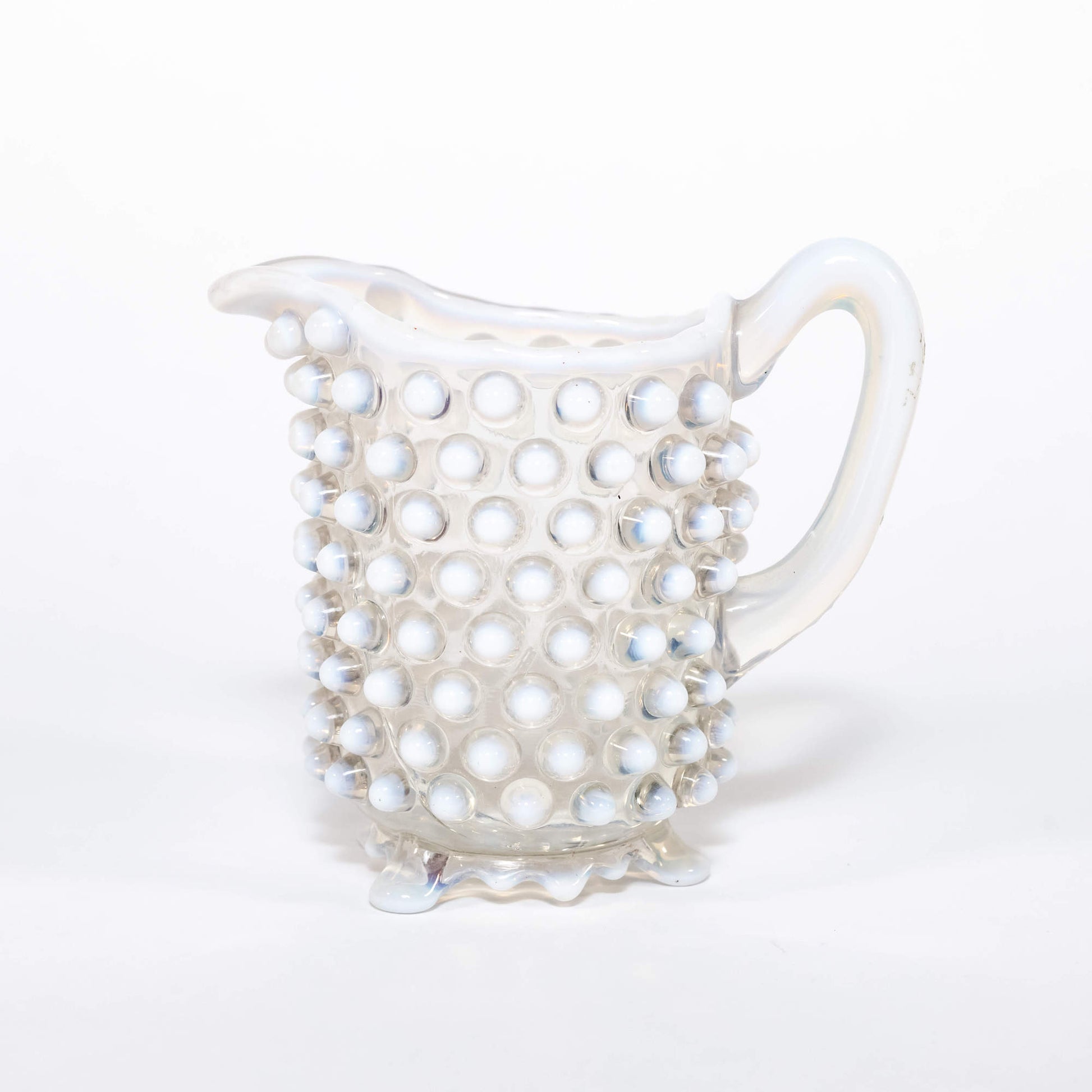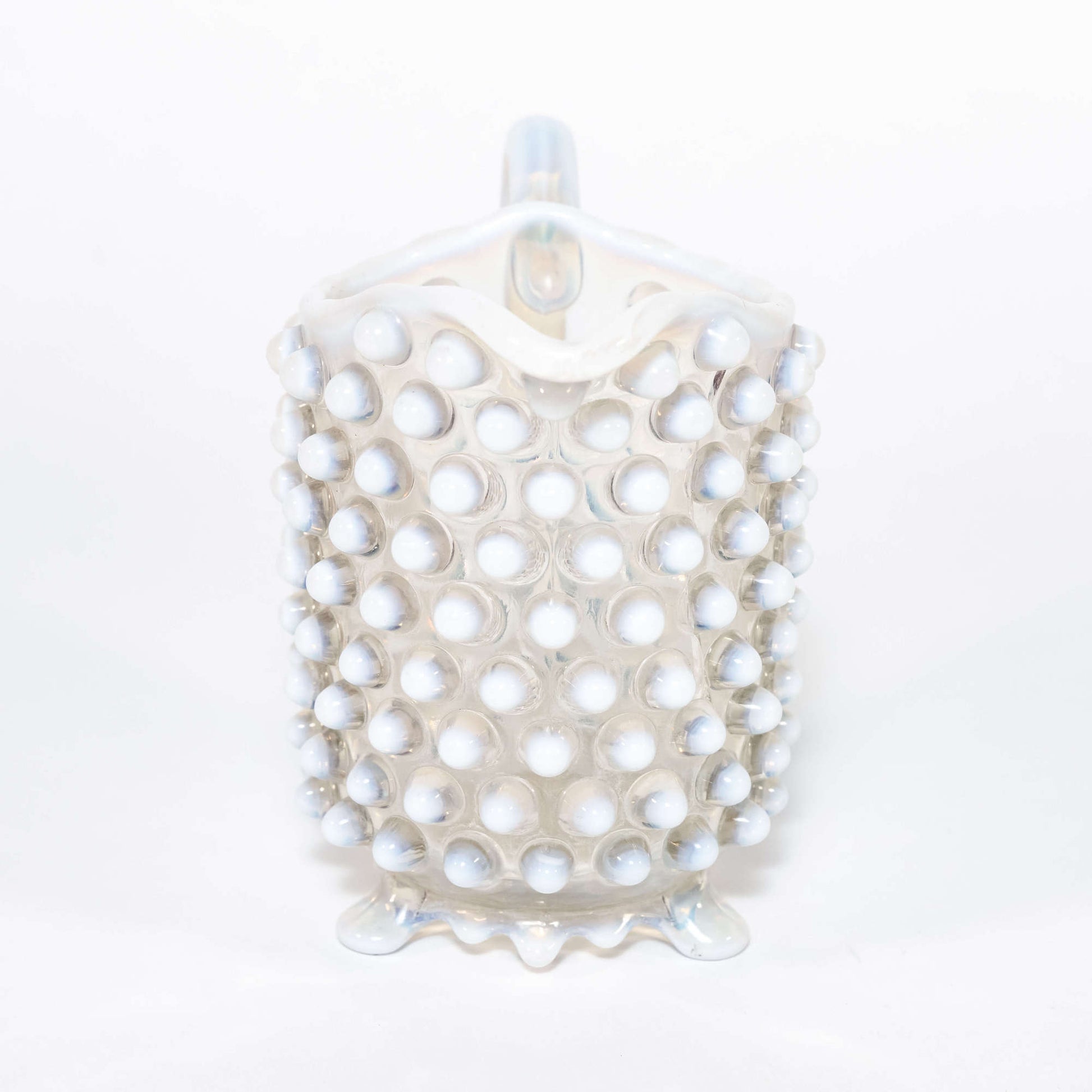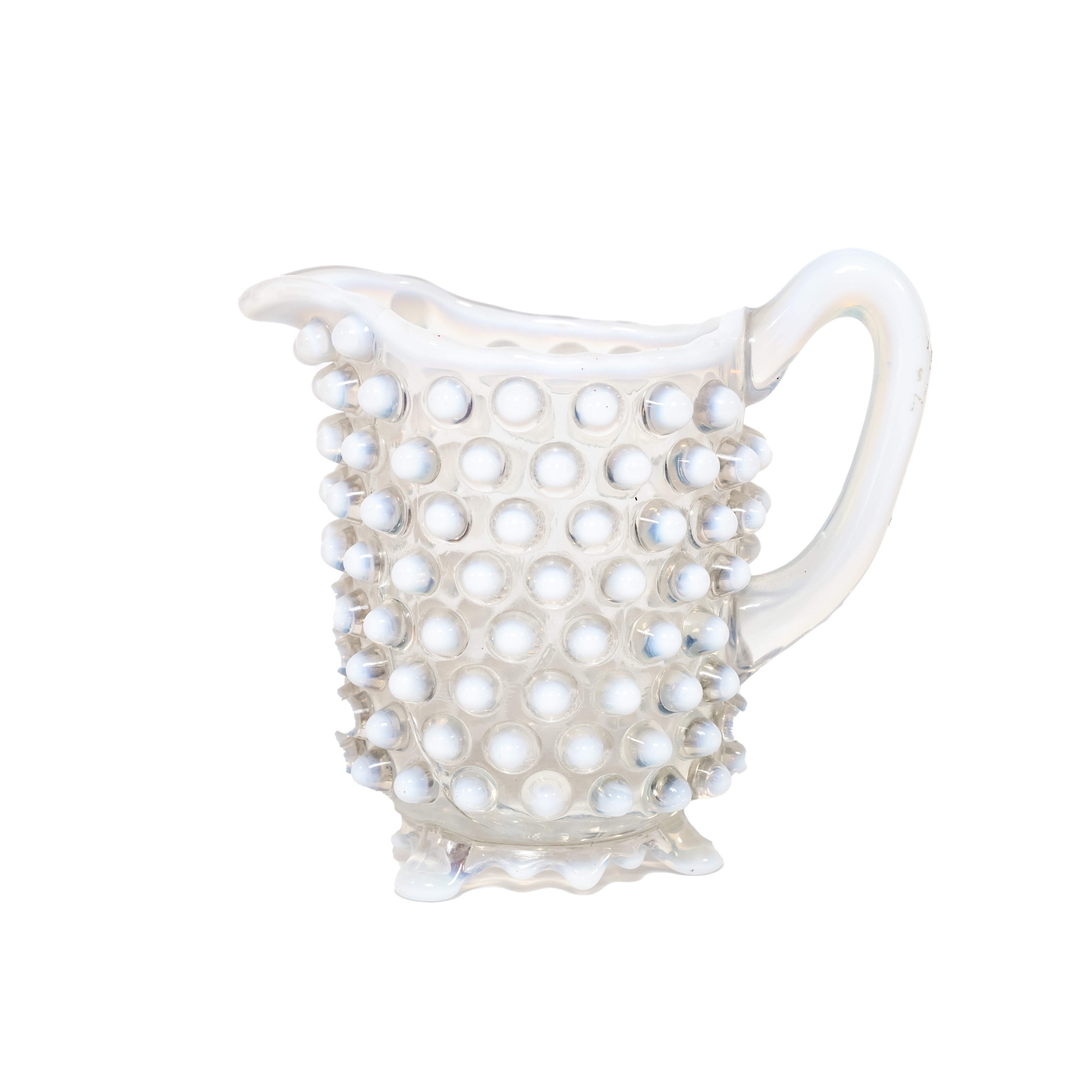 A lovely vintage, small hobnail pitcher, featuring a blue and white hue. The pitcher is in overall good condition but there is an small internal crack within the glass - this flaw seems to be stable and doesn't take away from the function and beauty of the pitcher.