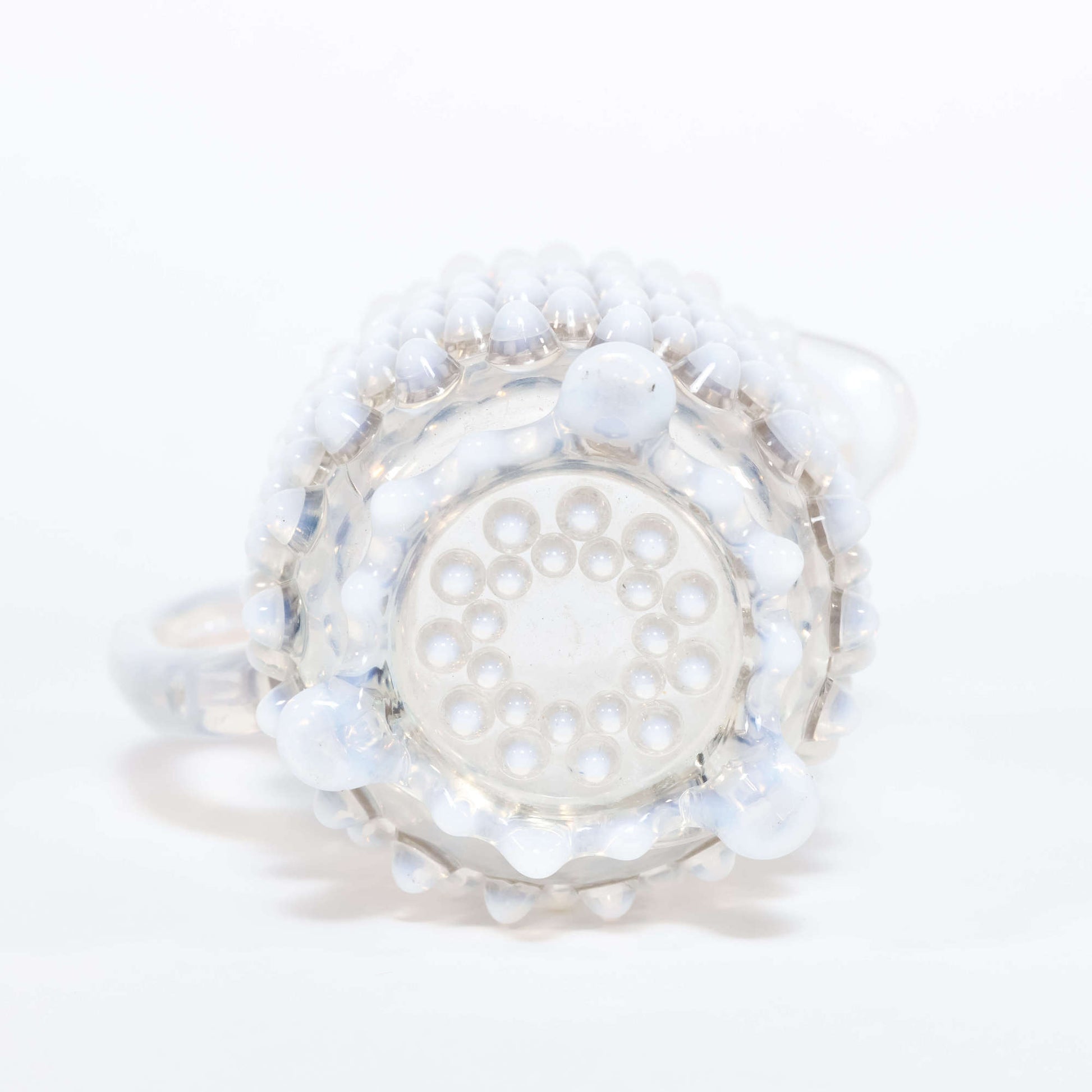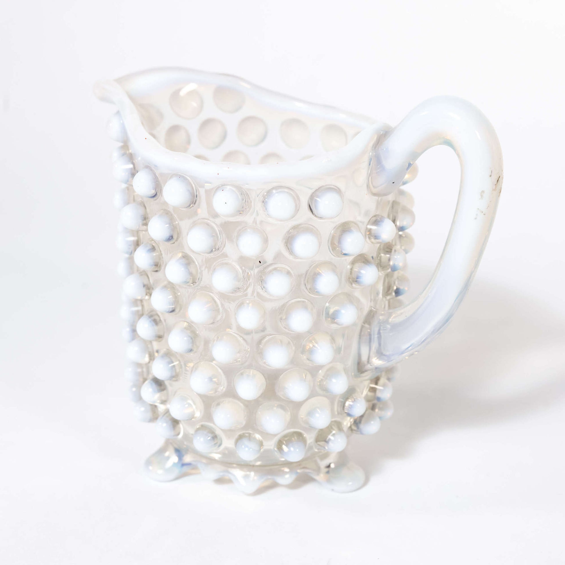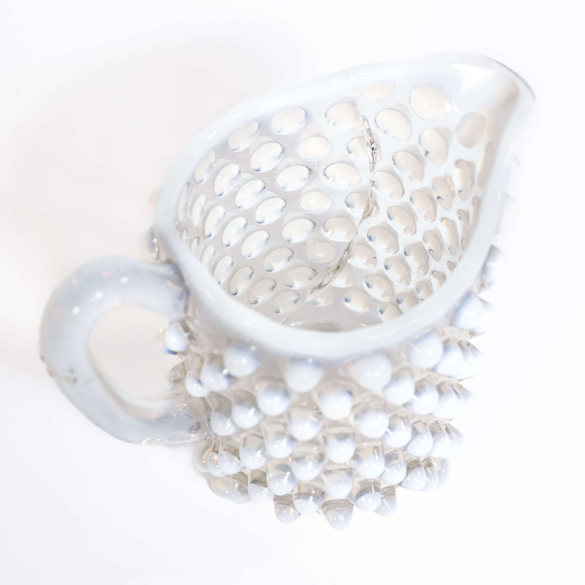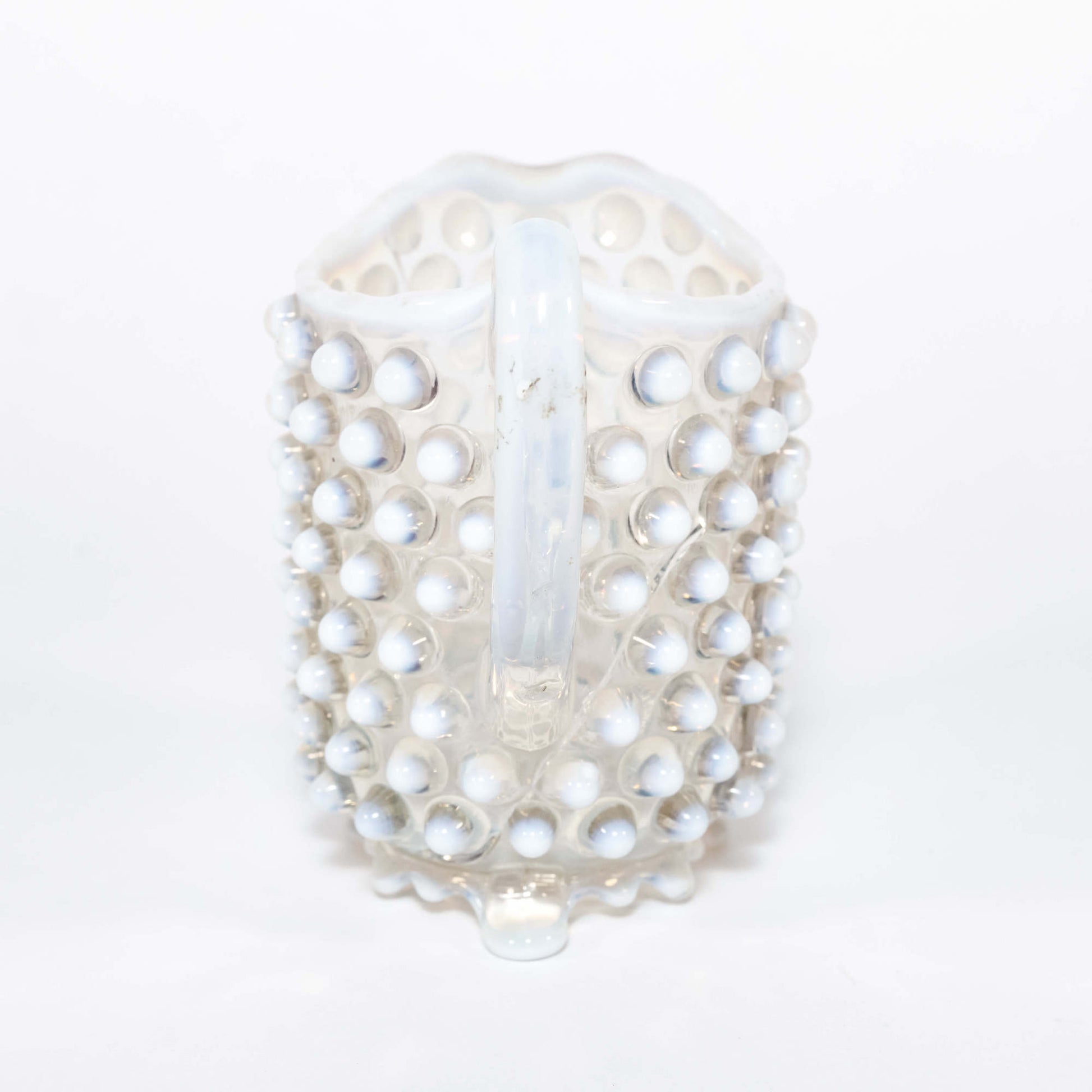 A lovely vintage, small hobnail pitcher, featuring a blue and white hue. The pitcher is in overall good condition but there is an small internal crack within the glass - this flaw seems to be stable and doesn't take away from the function and beauty of the pitcher.